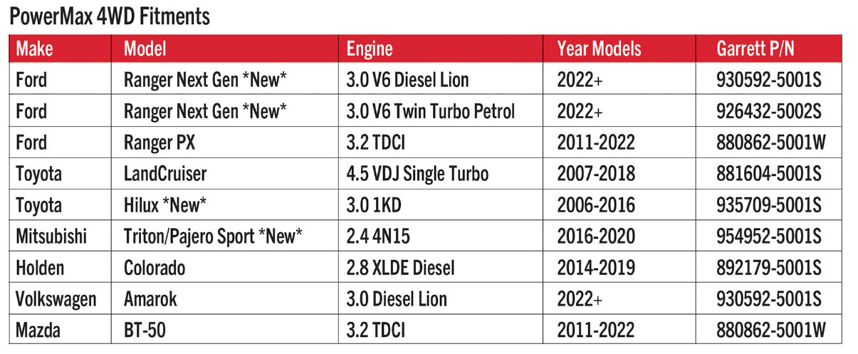 The range’s versatility is another strong point: Garrett offers PowerMax turbochargers tailored to a broad array of vehicles, from Australian diesel like the Toyota LandCruiser 70 and 79 series and Ford Next Gen Ranger 3.0L V6 diesels to petrol-driven performance cars such as Ford Ranger Raptor 3.0L V6 petrol.